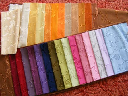 I have taffeta, brocade, satin, spandex, heavy cotton, linen, organza for curtains, even a few pieces of suede … It takes a lot to cut pieces from them, but at least I can enjoy so many colors…