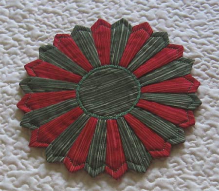 I fused the backing to the interfacing and finished the edges with zigzag stitches. Then I fused the pieced front, added the center circle (glued with Wonder Under) and stitched it through all the layers.Then I secured the edges of the front piece.
