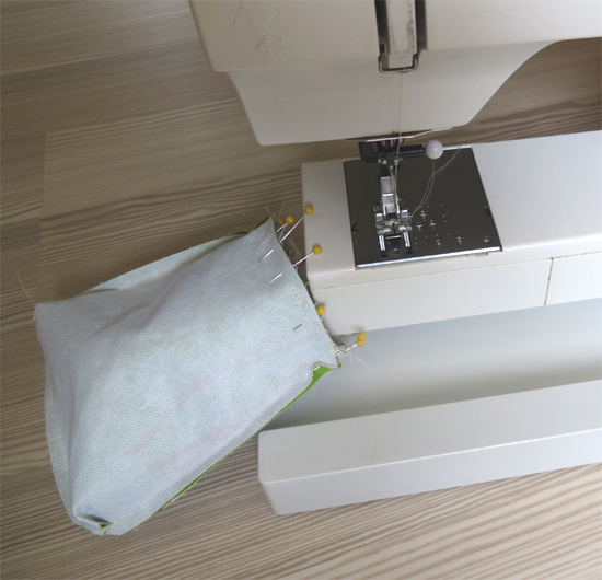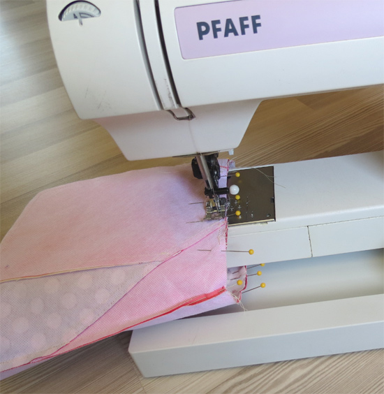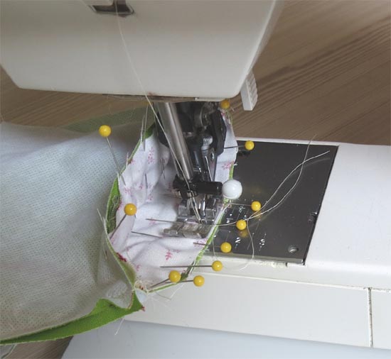 You have to remove the pins as you sew so that you can easily rotate the piece under the needle. A narrow sewing foot is helpful too, but I don’t have one.
